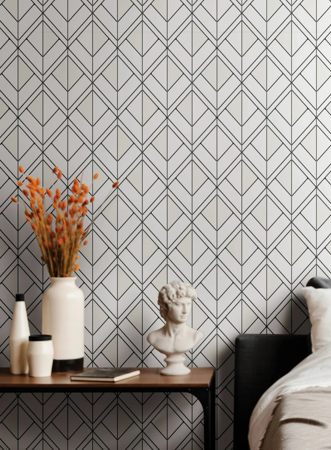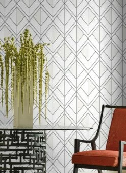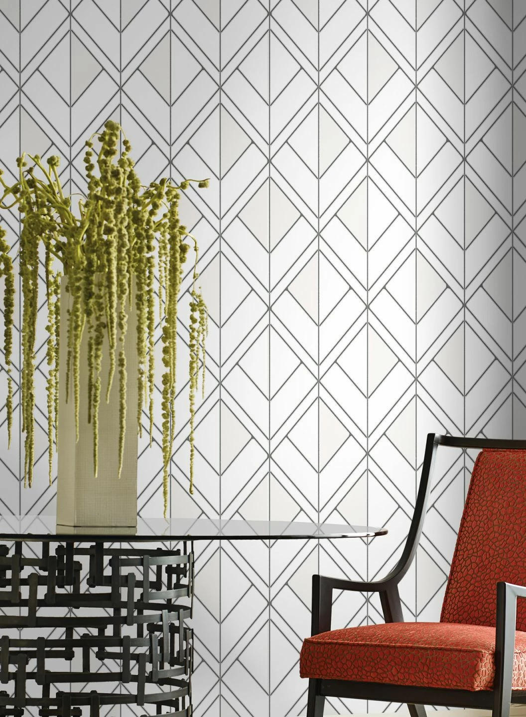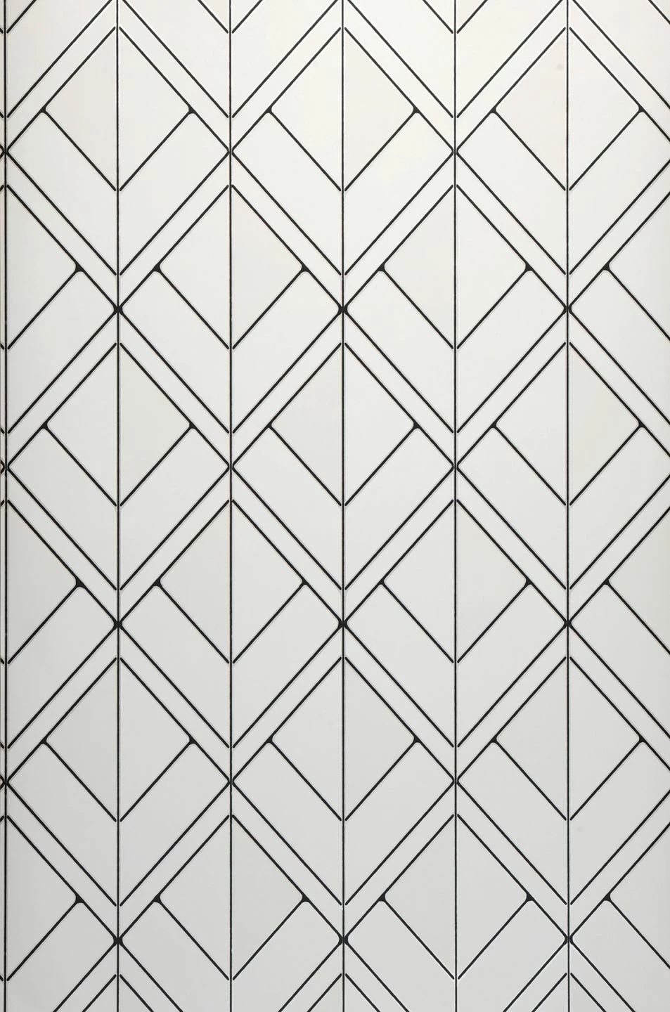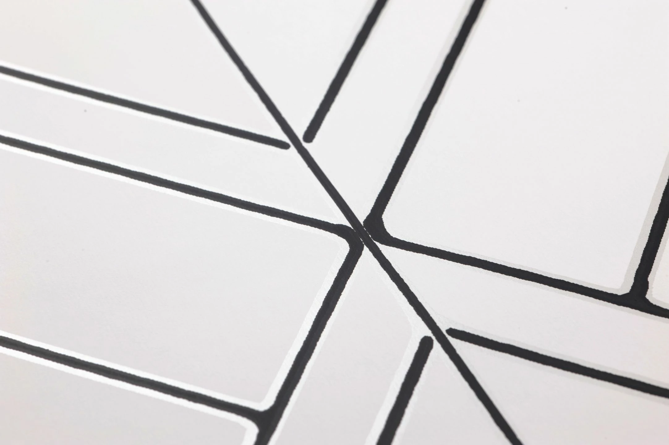 Schlichte, gerade Linien verlaufen parallel, kreuzen sich, fügen sich zu klaren geometrischen Formen zusammen. Dreiecke und Karos, Trapeze und verschieden breite Streifen entstehen und schaffen einen Eindruck von Klarheit und Ruhe. Die schlichte Farbgebung aus Schwarz, Weiß und Perlglanz-Weiß sorgt für einen reizvollen Kontrast aus matten und schimmernden Flächen. Die Tapete bildet einen idealen Hintergrund für Möbel in geschwungenen Formen und farbige Einrichtungselemente.