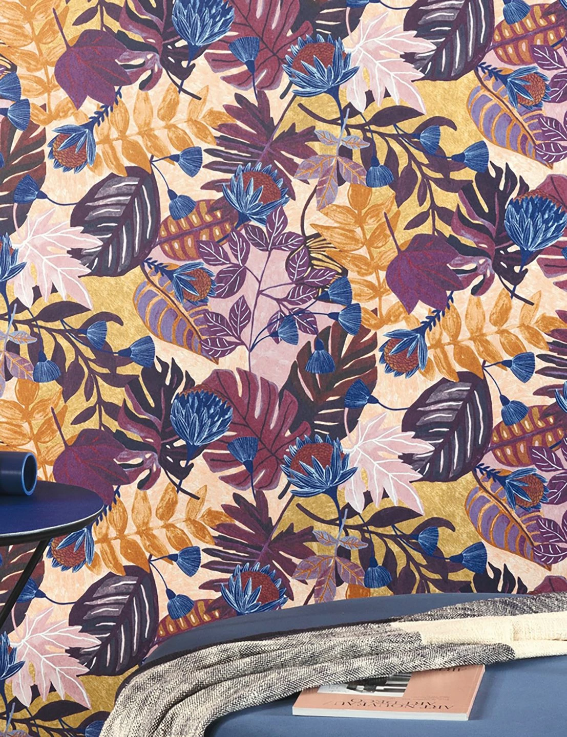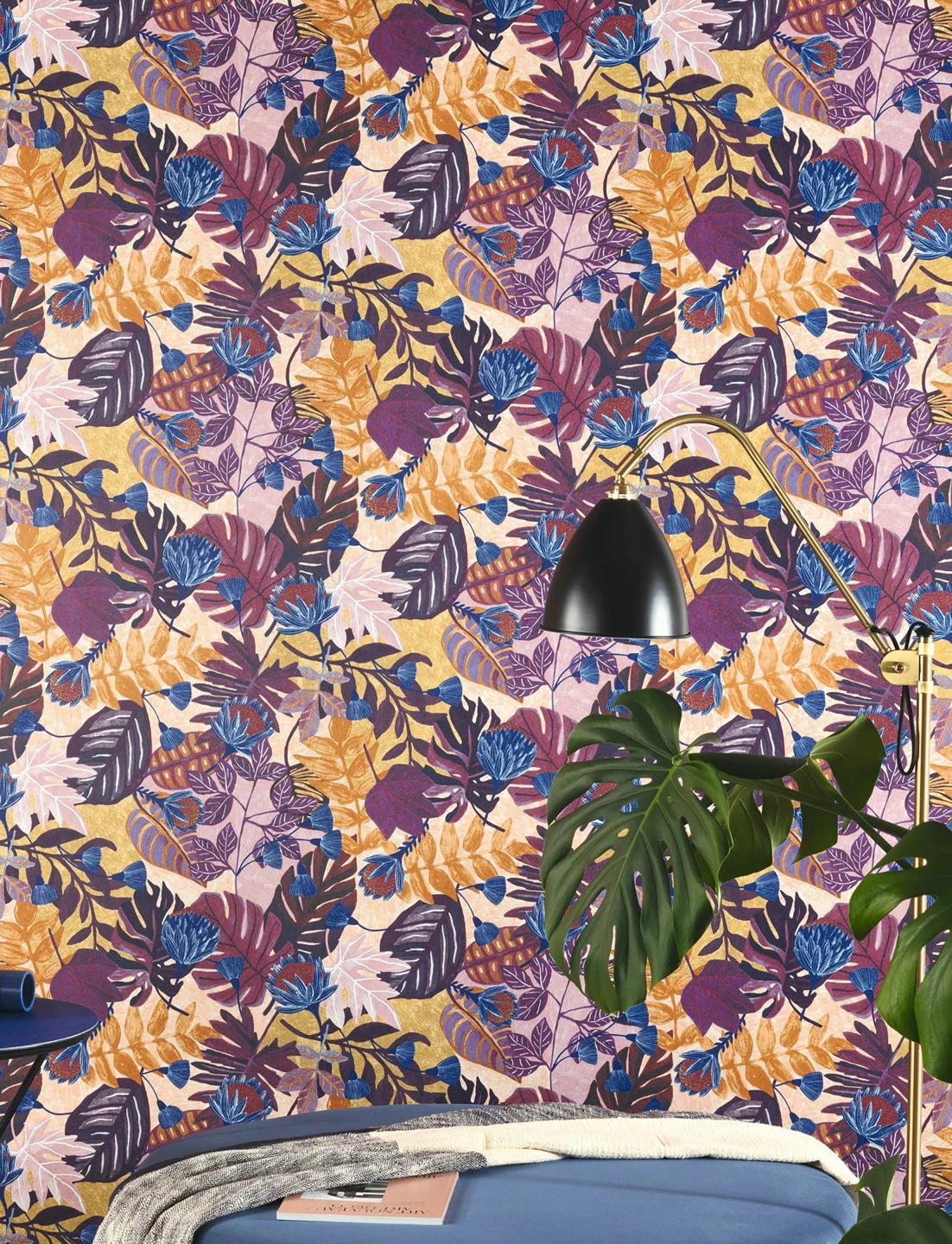 Unheimlich kunstvoll und wie handgemalt sind die Formen und Farben der exotischen Blätter und Blüten, die auf der Vliestapete Sunago wie in einem undurchdringlichen Dschungel durcheinander wachsen. Die expressive Farbgebung aus verschiedensten Nuancen von Violett, ergänzt durch Blau, Hellrosa und Orangebraun, erzeugt einen eindrucksvollen Effekt. Selbst der Untergrund trägt durch leicht marmorierte Flächen in Lachs, Ockergelb und Pastellviolett zur Ausdruckskraft des Musters bei.
