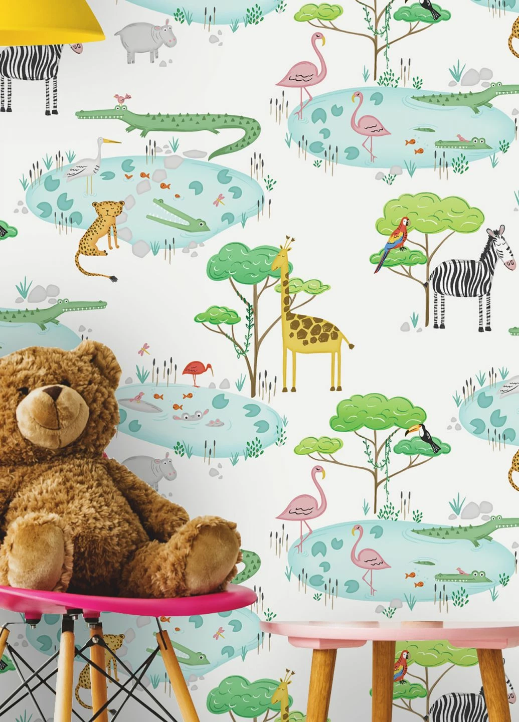 Irgendwo in einem tropischen Paradies tun sich diese Oasen mit wilden Tieren auf. Giraffe, Zebra, Flamingo, Krokodil, Tukan und viele weitere exotische Freunde tummeln sich am kleinen See und laden genau Dich ein, mitzuspielen. Die stimmungsvolle Mustertapete regt kindliche Fantasie in hohem Maße an und begeistert durch ihre sanften Pastelltöne.