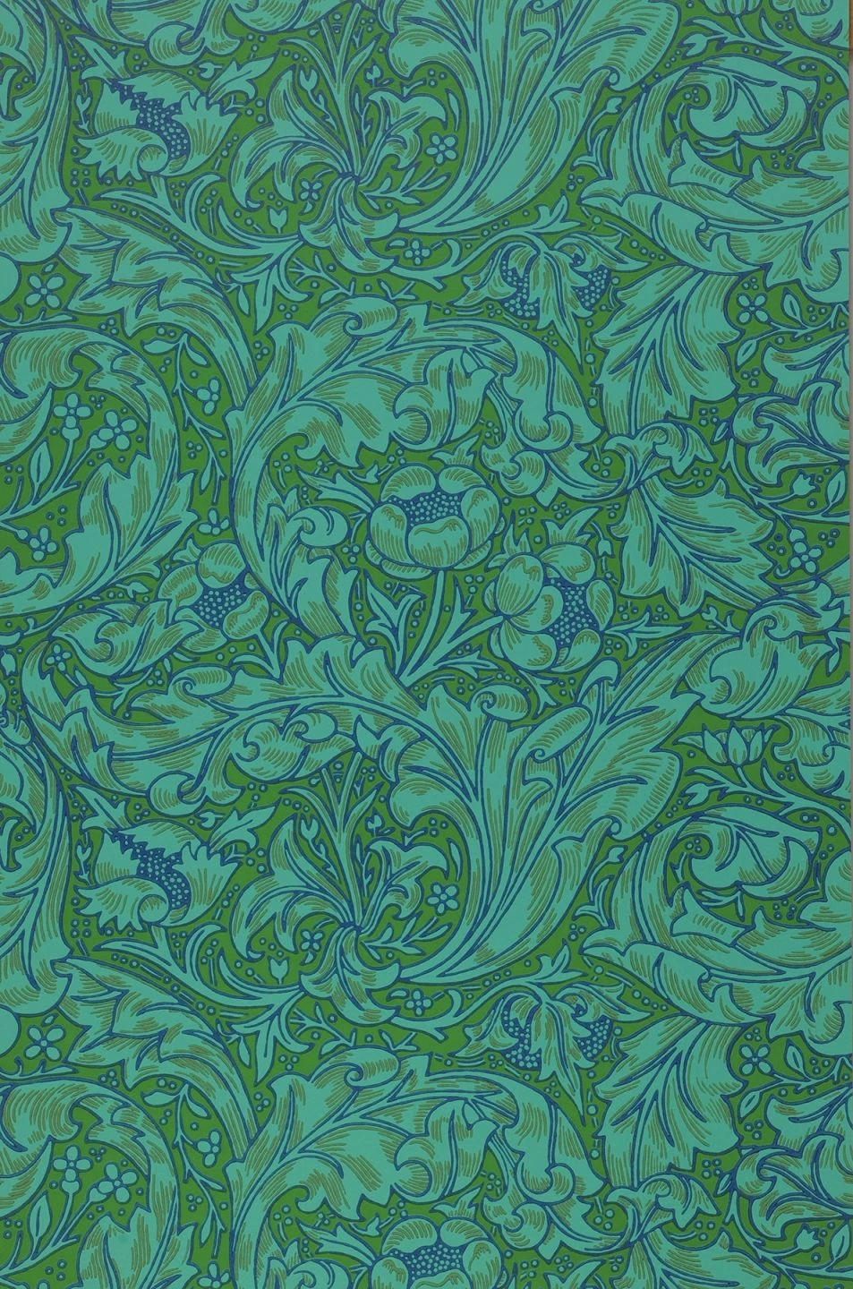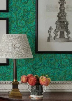 Verschiedene Grüntöne verbinden sich mit Saphirblau zu einem intensiven Farbenspiel. Das klassische Design aus Blüten, Blättern und Ranken wurde im traditionellen Leimdruck-Verfahren auf die Papiertapete aufgedruckt und entfaltet dadurch einen fast handgemachten Charakter. Die Tapete bildet eine stimmige Ergänzung zu antiken Möbeln in dunklen Farben, macht aber auch in Verbindung mit Weiß oder einer passenden Wandfarbe eine gute Figur.