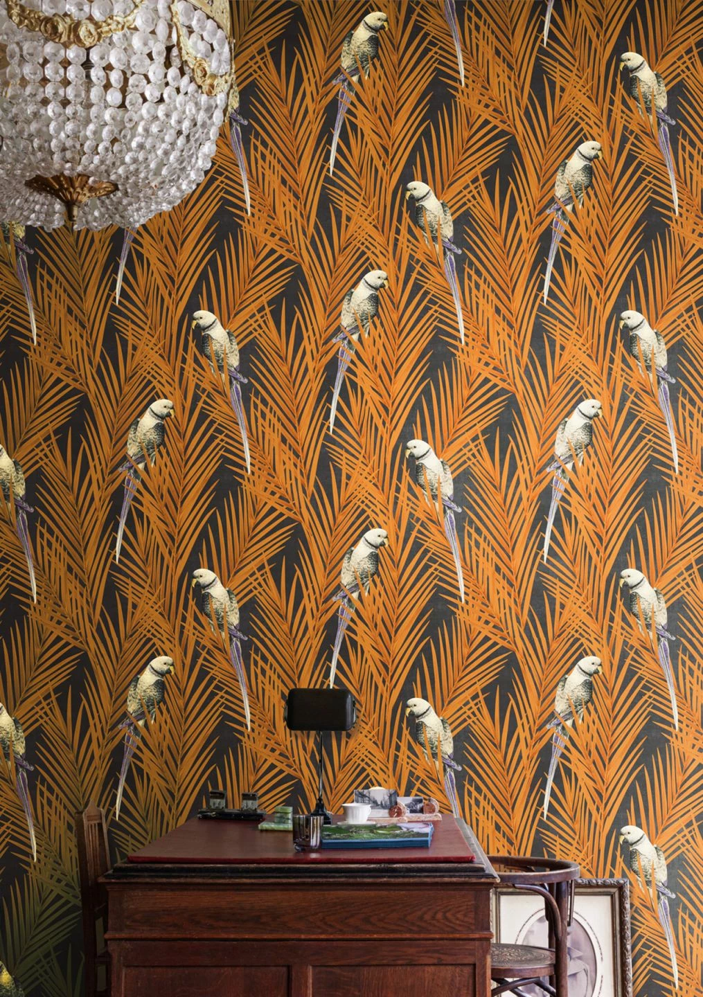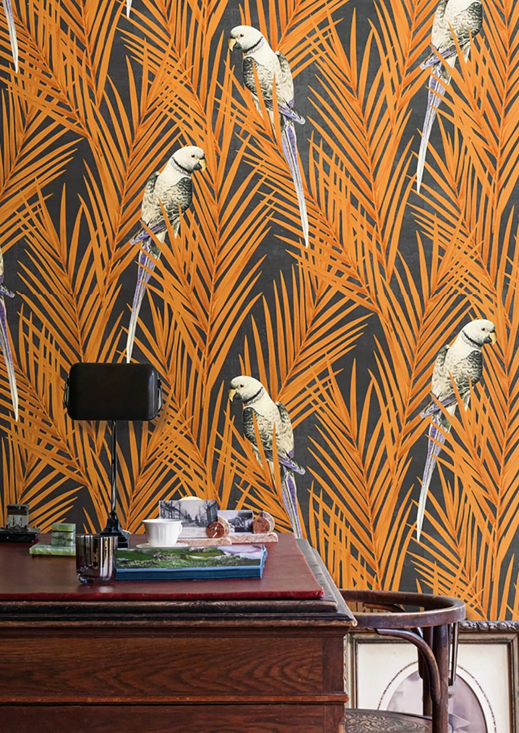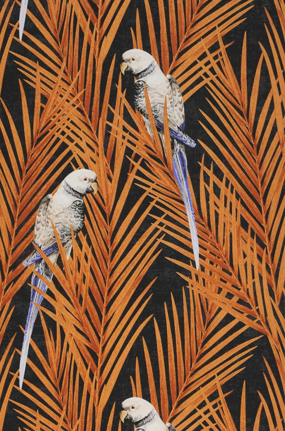 Das ausdrucksstarke Orangebraun der Palmwedel auf dezentem, anthrazitfarbenem Hintergrund bringt diese Vliestapete zum Leuchten. Sittiche mit violetten Schwanzfedern verstärken den exotischen Charakter des Wandschmucks. Setzen Sie einen Kontrapunkt mit dunklen Holzfarben oder mit Schwarz und lassen Sie die Tapete ihre ganze Strahlkraft entfalten!