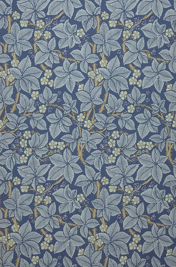 Ein Dickicht aus stilisierten Brombeerranken voller Blätter mit ihren ausgeprägten Blattadern, duftiger Blüten in hellem Elfenbein und dunkler reifer Beeren erstreckt sich über die Papiertapete aus dem Hause Morris & Co. Der historische Entwurf der englischen Künstlerin Kate Faulkner, einer Zeitgenossin von William Morris, zieht seine ausgeglichene Stimmung aus den vorherrschenden ruhigen Blautönen.