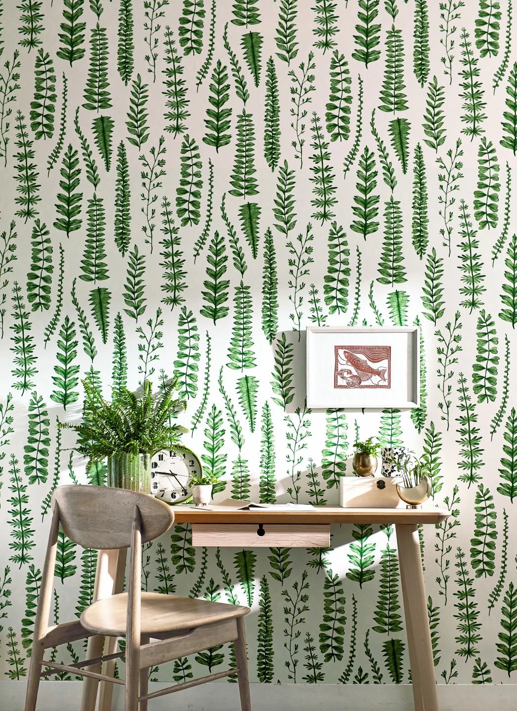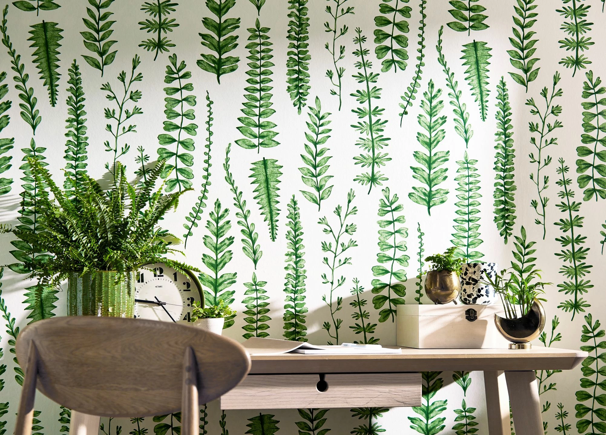 Die Formenvielfalt der verschiedensten Farnarten strukturiert Ihre Wand mit ihren leichten, symmetrischen Blättern und den leuchtenden Grüntönen. Auf dem cremeweißen Untergrund der Vliestapete sind die Farne luftig wie in einem botanischen Album angeordnet. So wirkt die Tapete hell und freundlich. Besonders reizvoll ist das entstehende Zusammenspiel zwischen dem botanischen Design und Ihren Grünpflanzen als Deko-Elementen.