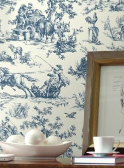 Ganz im Stil der Baumwollstoffe, die im 18. Jahrhundert in Frankreich mit gravierten Kupferplatten bedruckt wurden und besonders filigrane, detailreiche Darstellungen ermöglichten, ist diese kostbare Papiertapete gehalten. Im typischen blauen Farbton auf weißem Grund weist sie Szenen historischen Landlebens auf. Der Stil des Toile de Jouy war von den zarten Malereien auf chinesischem Porzellan inspiriert und macht Ihren Raum zu einer wahren Kostbarkeit.