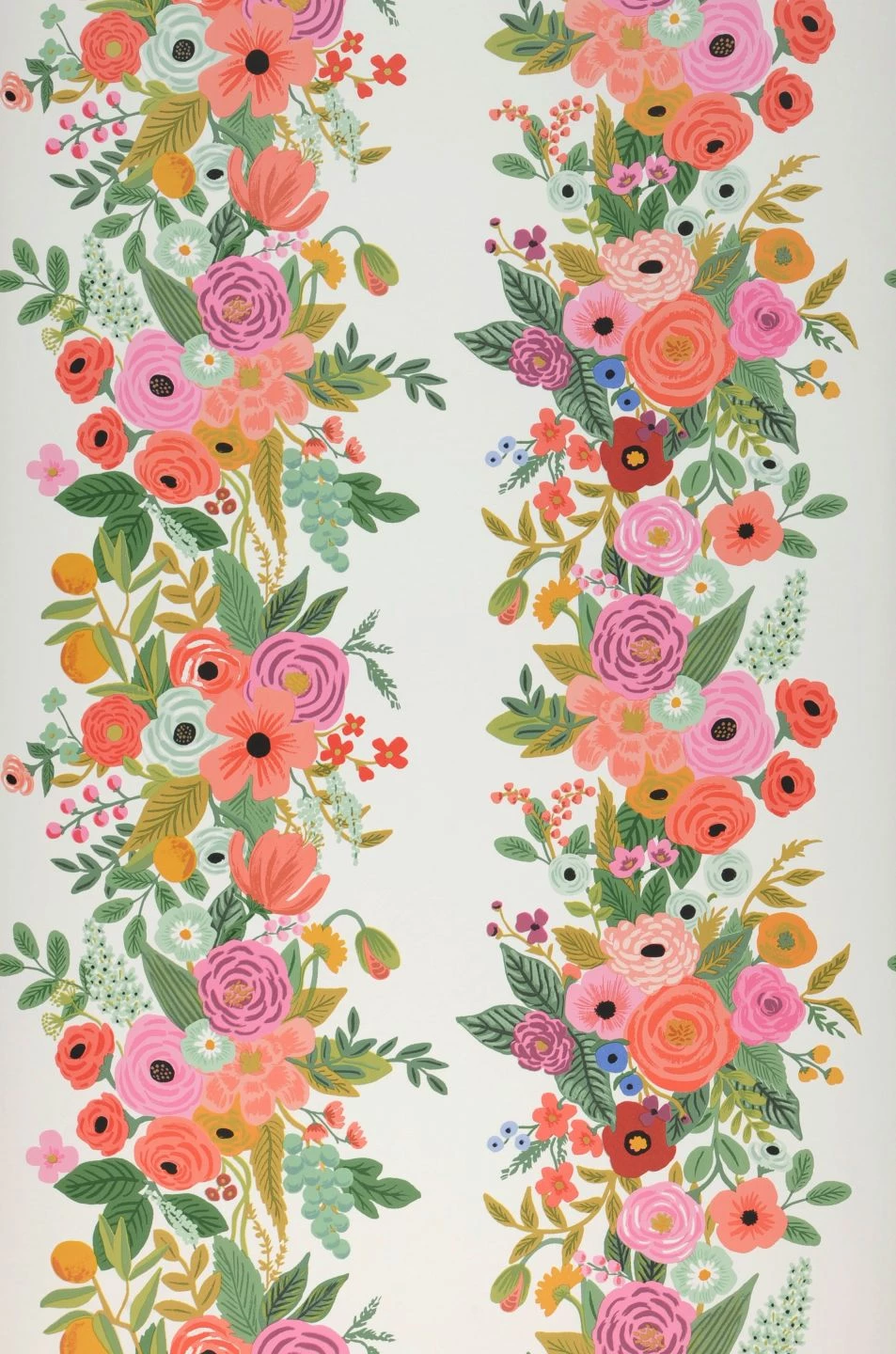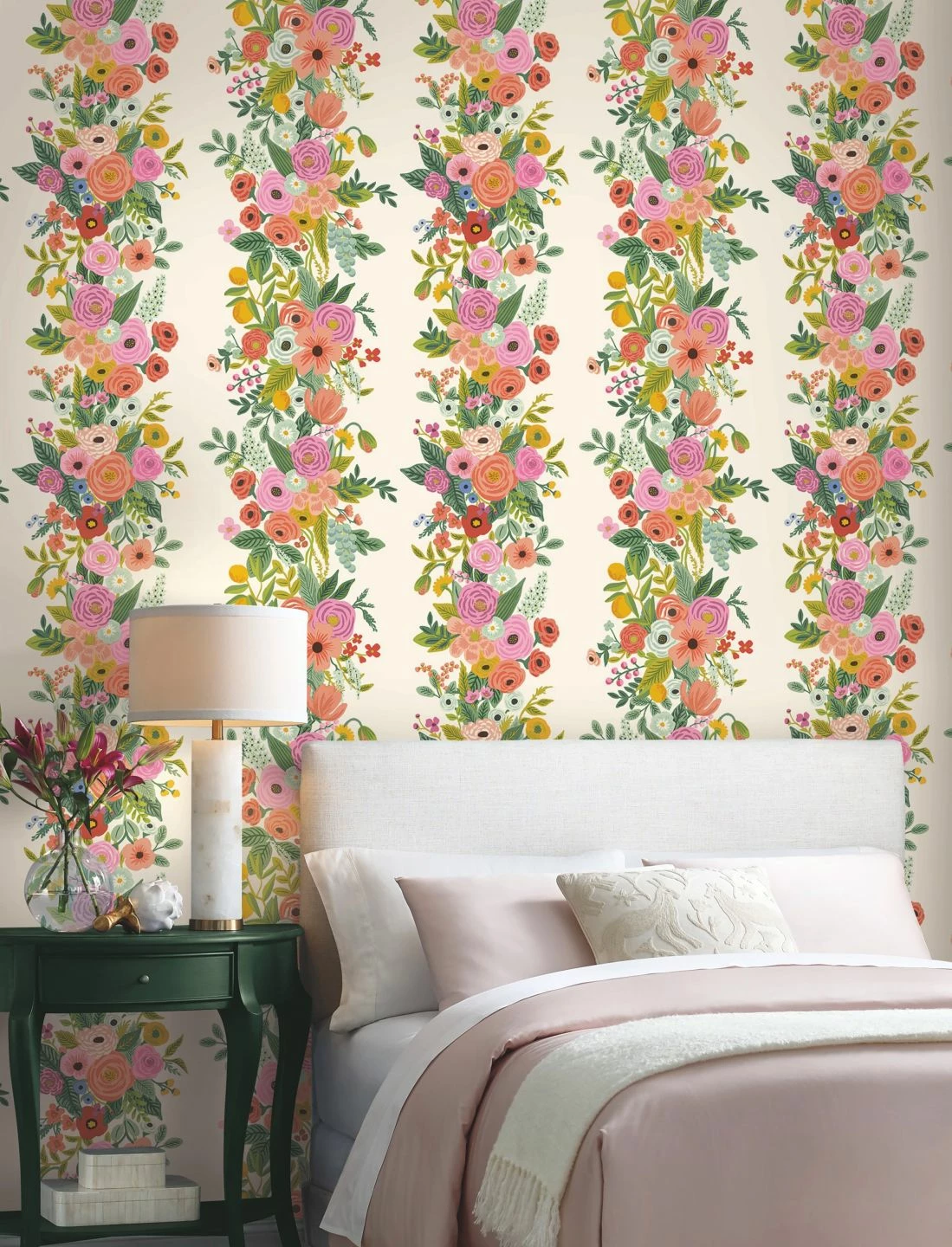 Streifen-Design trifft auf Blumenmuster – und es entsteht etwas ganz Eigenes! Die wie handgemalt wirkenden Blumen in Rosatönen, Goldgelb und zartem Blau, die auf der Papiertapete Trellis Garden von der Fülle des Sommers erzählen, sind säulenförmig angeordnet, so als würden sie die Pfeiler einer Pergola oder die Säulen eines Herrenhauses umranken. So betont das Design locker und lebhaft die vertikale Dimension Ihres Raumes.