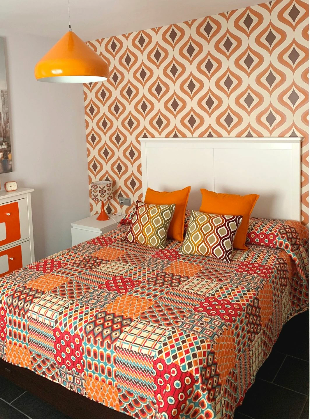 Das ausgeprägte Muster im Stil der 70er Jahre lässt an die geschwungenen, sich gegeneinander drehenden Formen eines vom Wind bewegten Mobiles denken. Die sanften, abgerundeten Rauten und Wellenlinien in Orange, Braun und Hellelfenbein, die als Relief in der Vinyloberfläche fühlbar sind, passen perfekt zu Möbeln im Retro-Stil. Die waschbeständige Tapete lässt sich sogar in Ihrem Bad stilvoll einsetzen.