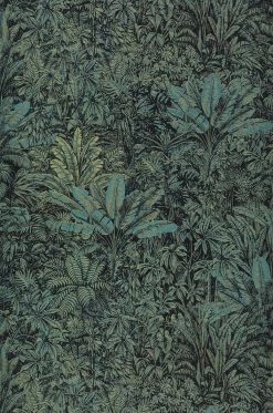 Voll von üppigem pflanzlichem Leben ist die Tapete, auf der tropische Farne und Palmblätter abgebildet sind. Die Schraffur der Blätter in matter Goldfarbe und kühlem Türkisblau betont ihre Struktur und schafft die Illusion einfallenden Sonnenlichts und damit von räumlicher Tiefe. Geheimnisvoll und gleichzeitig einladend wirkt das Dickicht der verschiedensten Blätter.