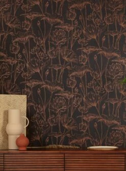 Auf dem schwarzbraunen Grund scheinen die Lotosblumen, deren imposante Blüten und kräftige Blätter nur durch zarte, leicht schimmernde Linien in Perlkupfer und Silberglitzer angedeutet sind, beinahe zu glühen. Umbra gibt der Themenwelt Orient eine geheimnisvolle ästhetische Note und macht Ihren Raum zu einem Märchenreich. Sorgsam gewählte Einrichtungsstücke in den Kupfertönen des Musters komplettieren den sagenhaften Look.