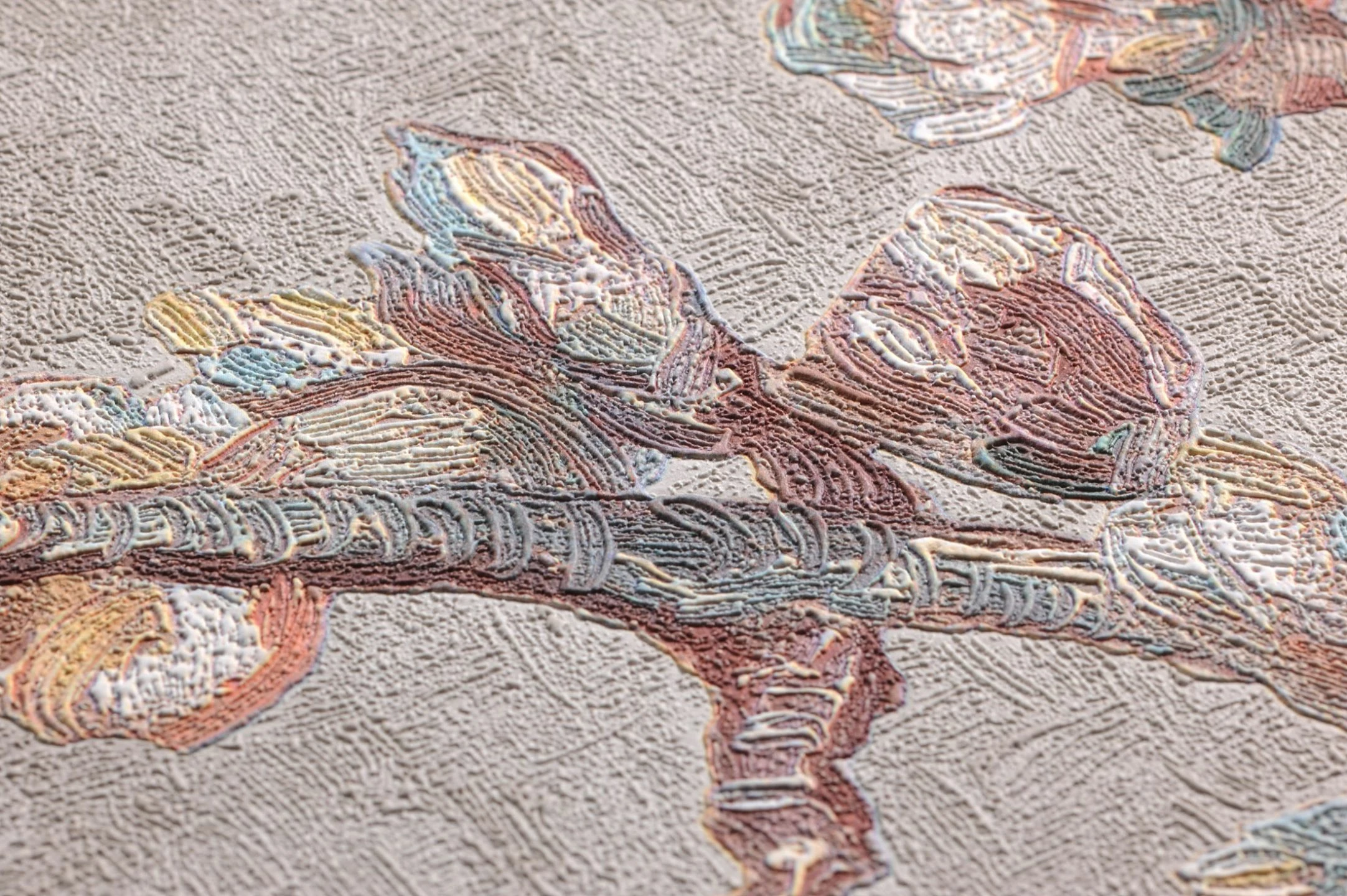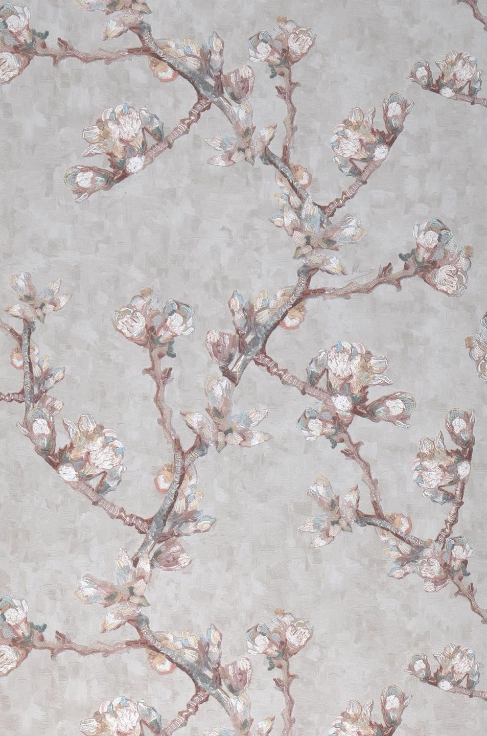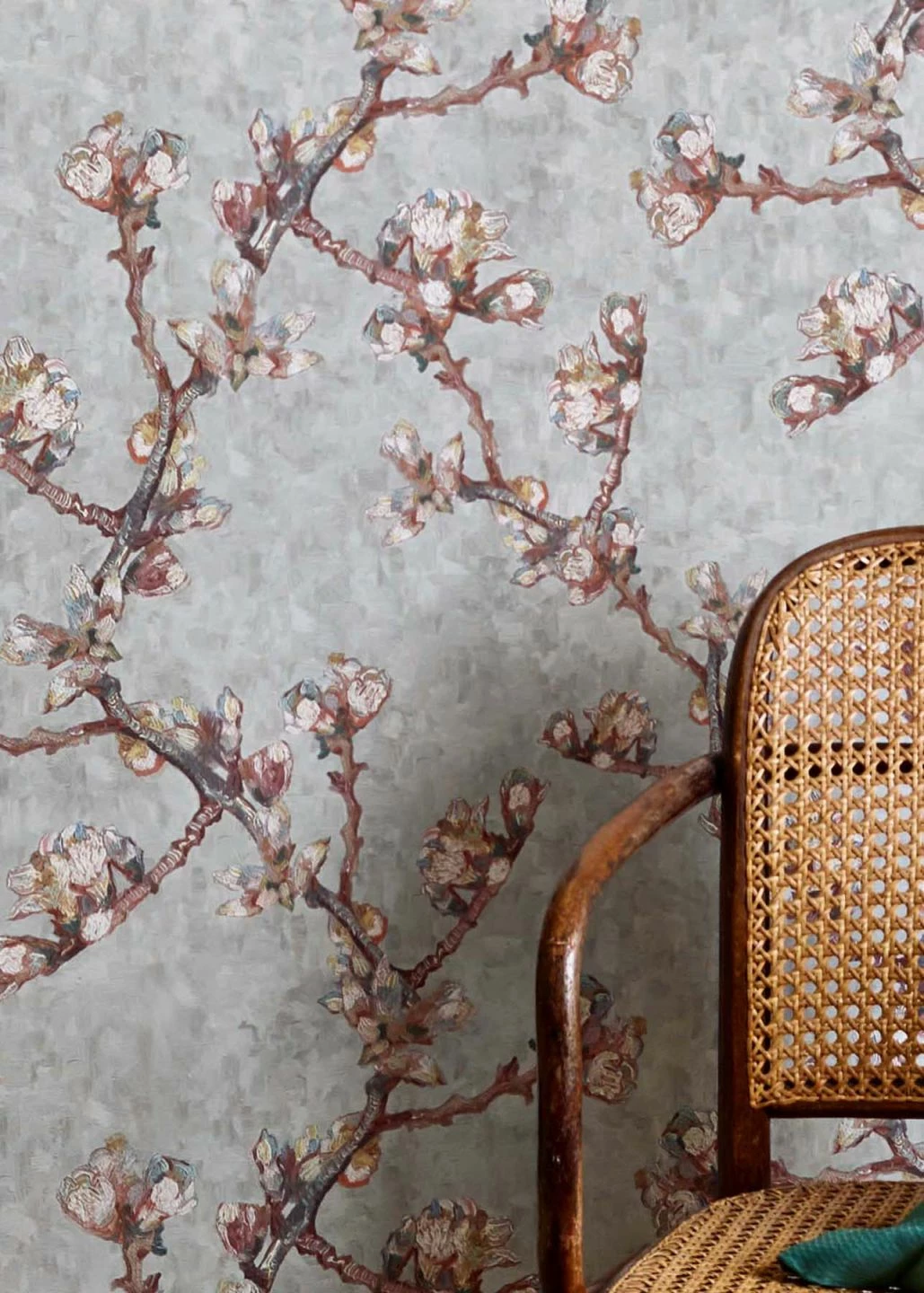 Die blühenden Zweige außer Rand und Band – Auf dem grauen Hintergrund entwickelt das Naturschauspiel eine recht rasante Eigendynamik, die in alle Richtungen ausschlägt. Wachstum wird auch durch die feine Strukturierung der Tapetenoberfläche sichtbar, die an die Kraft der Pinselführung erinnert.