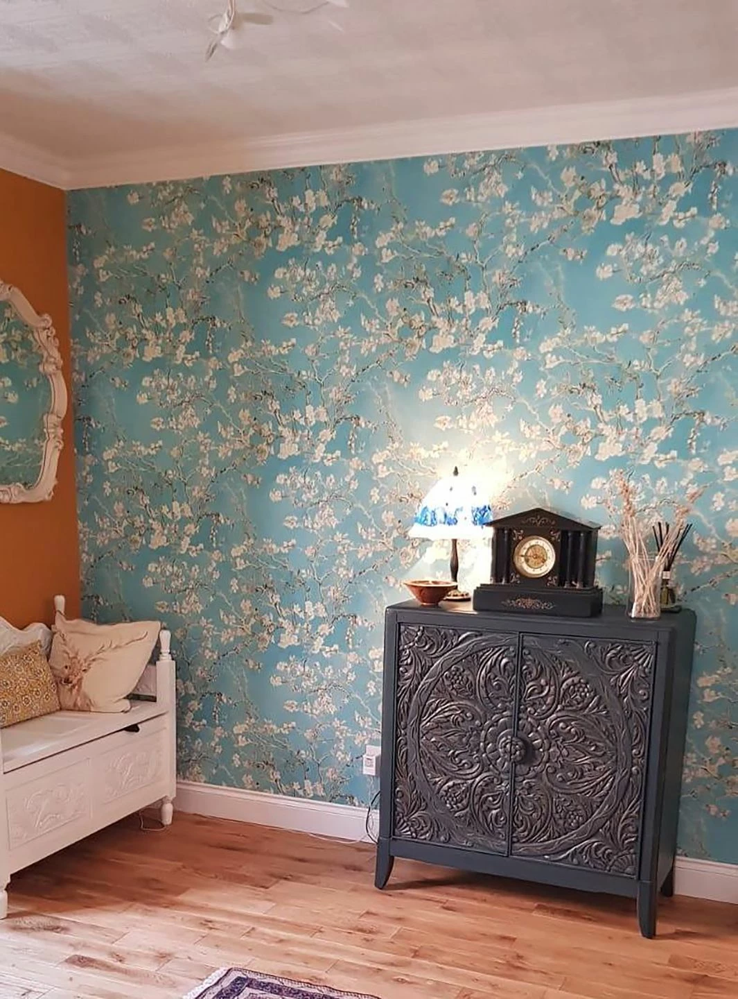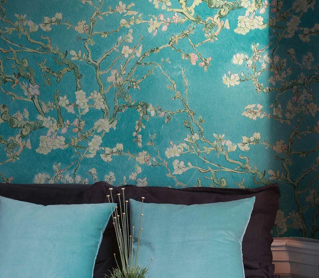 Inspiriert von den Gemälden Vincent van Goghs, zeigt die Vliestapete Mandelzweige voller zarter Blüten auf strahlend türkisfarbenem Grund, so als würde man durch die Zweige hindurch den wolkenlosen Sommerhimmel sehen. Die kräftigen Pinselstriche van Goghs sind in der Vinyloberfläche fühlbar. Gleichzeitig sorgt das hoch waschbeständige Oberflächenmaterial dafür, dass Sie die Tapete selbst in einem Badezimmer einsetzen können.