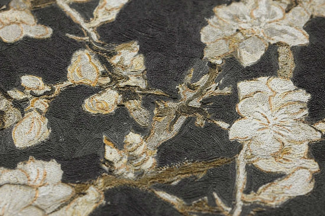 Vor dem umbragrauen Hintergrund, strukturiert durch die fühlbaren Pinselstriche im Vinyl der Oberfläche, wirken die von van Goghs Gemälde inspirierten Mandelblüten besonders filigran und zerbrechlich. Die rauen, knotigen Zweige und die zart cremeweißen Blüten sind detailgetreu dargestellt. Die hoch waschbeständige Vinyloberfläche sorgt dafür, dass Sie freie Hand haben: Selbst für Ihr Badezimmer ist die Tapete problemlos geeignet.