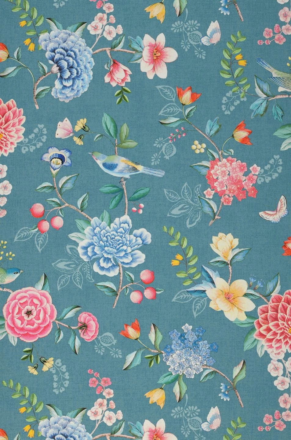 Leuchtende Farben mit fließenden Übergängen, die einen fast plastischen Eindruck erzielen, schmücken die Blumen, Vögel und Schmetterlinge auf dieser Tapete. Der türkisblaue Hintergrund hat die Farbe des Sommerhimmels. Das Oberflächenmaterial aus Vinyl sorgt für intensive Farben und hat eine leichte fühlbare Struktur wie ein gewebter Stoff. Es ist waschbeständig und auch für das Bad geeignet.