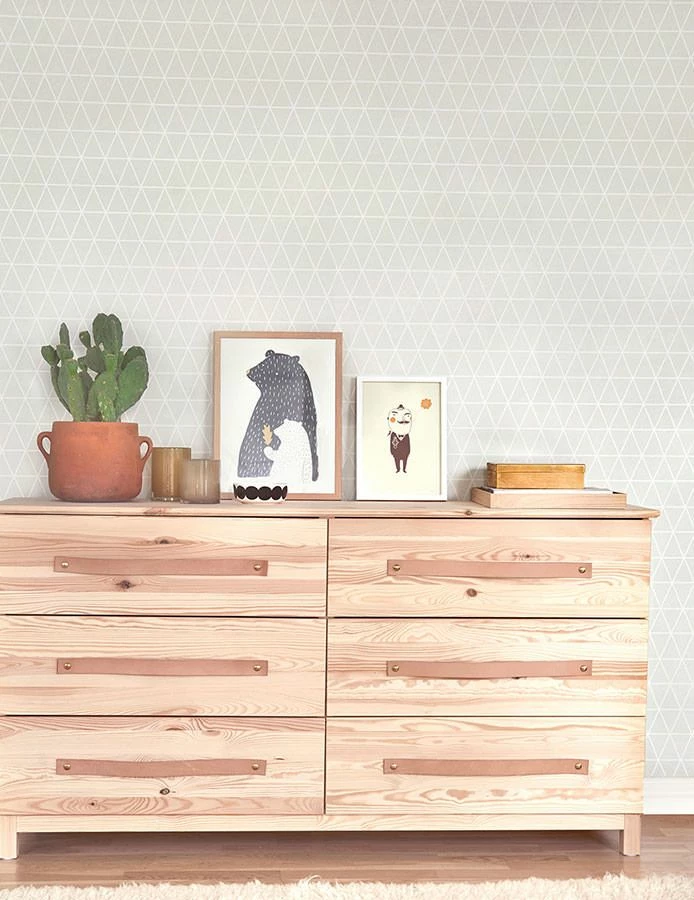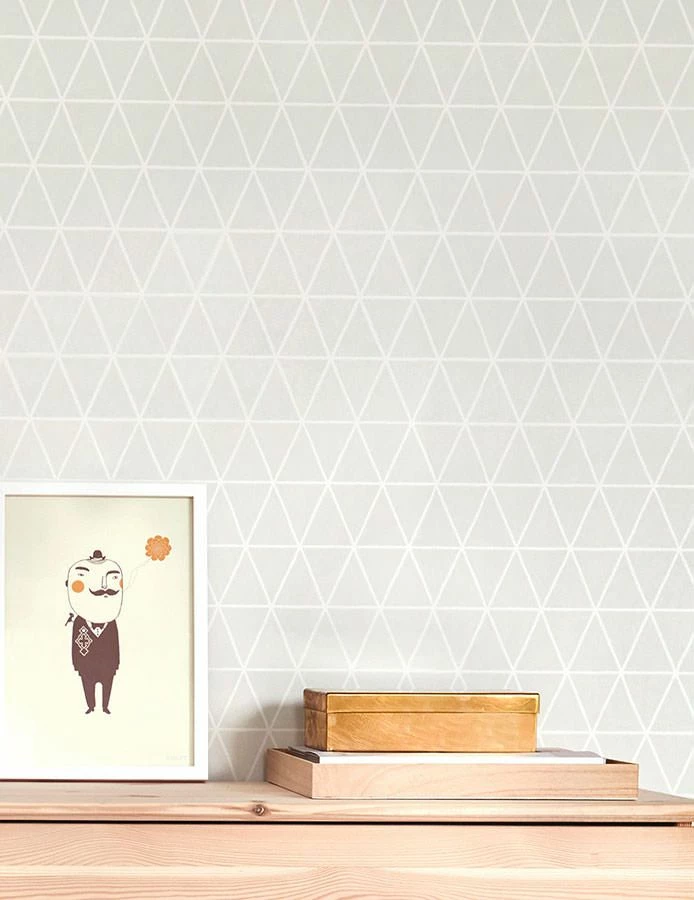Skandinavisches Geometrie-Design klar und munter inszeniert von der schwedischen Tapetenmanufaktur Majvillan – Muster Tapete Viggo setzt auf die Verschmelzung von Dreiecken zu Rauten und eine sanfte Verbindung der Farben Blassgrau, Grauweiss, Weiss. Die hochwertige Vliestapete mit waschbeständiger Oberfläche ist nicht nur im Kinderzimmer ein zeitloses Design-Highlight.