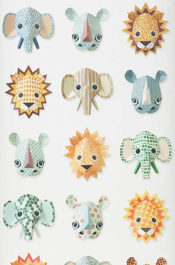 Wild Animals ist eine Designtapete aus dem Studio Ditte und zeigt Tierköpfe von Elefant, Nashorn und Löwe in verschiedenen Farben und Mustern, die wie plastisch wirken. Eine perfekte Illusion.