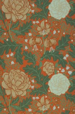Das florale Renaissancemuster in Leimdruckoptik ist für stilvolle Räume gedacht, die eine sinnliche Gestaltung bevorzugen. Es verkörpert die Schönheit der französischen Bildwirkerei, die auch als Gobelin bekannt ist. So entsteht ein sehr haptischer warmer Eindruck, der durch die Farben Hellbeige, Grauweiß, Pastelltürkis, Rot und Grüntöne verstärkt wird.