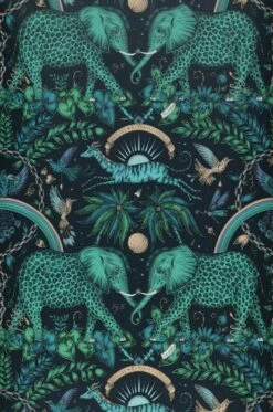 Wie die Reise in eine Phantasiewelt mutet diese extravagante Vliestapete an: Zwischen Symbolen von Sonne, Sternen und Planeten, Regenbögen, Palmen und Blattranken fällt der Blick auf Elefanten mit Leopardenmuster, gestreifte Antilopen mit langen Ringelschwänzen, bunte Vögeln und Insekten. Auf dem dunklen, blaugrünen Grund wirken die Blau- und Grüntöne geheimnisvoll wie in einer Mondnacht. Mit „Zambezi“ gestalten Sie ihren Raum phantasievoll und ausgefallen. (Kathmandu)