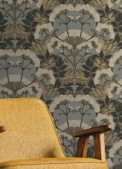 Das Muster aus stilisierten Pflanzen der Schafgarbe, das mit seiner symmetrischen Anordnung unverkennbar in der Tradition des Jugendstils steht, macht diese Vliestapete zu einem ästhetischen Genuss. Schlicht und charaktervoll zugleich ist die Farbwahl aus hellem Elfenbein, Perlbeige und Anthrazit auf grauem Grund. Die Tapete ist im traditionellen Leimdruckverfahren gefertigt und verleiht Ihrem Raum – besonders in Verbindung mit Vintage-Möbeln – das gewisse Etwas.
