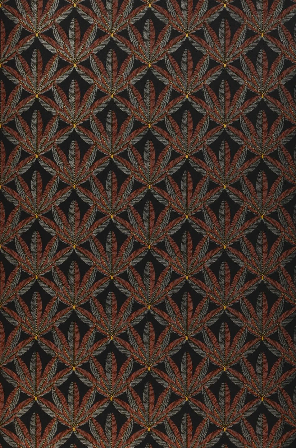Ornamente aus stilisierten Blättern, mit wenigen kupferbraunen und hellgrauen Linien schraffiert auf dem schwarzbraunen Grund, bilden das wirkungsvolle Design im Stil des Art Deco. Die dunklen Farbtöne schmücken Ihren Raum und lassen ihn ruhig und hochwertig wirken. Gelbe Punkte verzieren das Muster der Vliestapete mit hellen Highlights. Charaktervolle Retro-Möbel in dunklen oder rötlichen Holztönen sind eine perfekte Ergänzung.