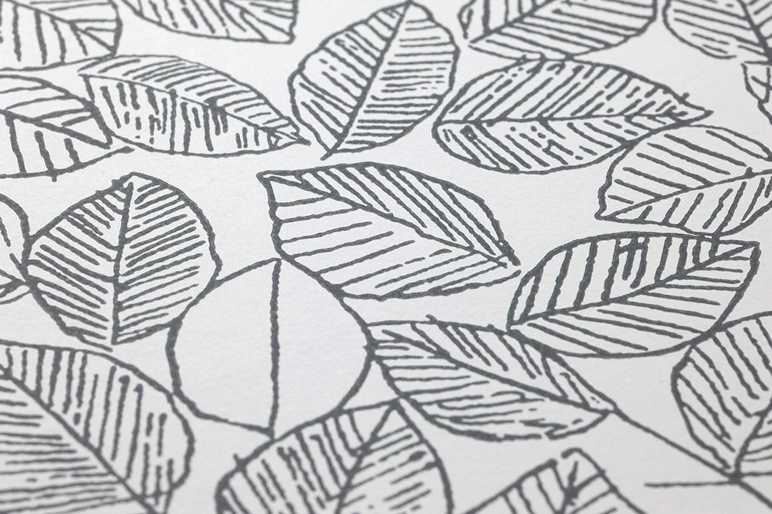 Das feingezeichnete Blattwerk der floralen Designer Tapete in Weiß und Anthrazit zeigt im Raum zwei besondere Gesichter. Das dichte aber willkürlich angeordnete Blättergeflecht wird durch einige unvollendete Elemente unterbrochen, die aus der Ferne betrachtet ein kunstvoll abstraktes Muster ergeben. Der sensible Blattcharakter bleibt gleichwohl erhalten.