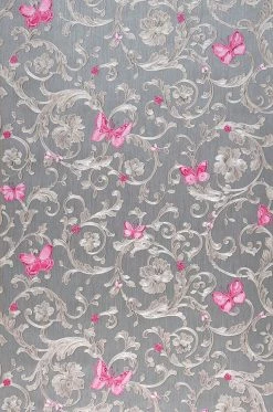 In leuchtendem Magenta stechen liebliche Schmetterlinge und Marienkäfer auf der Romantik-Barocktapete von Versace hervor. Die schimmernden Rankenornamente in Braunweiß und Graubraun heben sich fühlbar vom grauen Tapetenfond ab. Die widerstandsfähige Vinyloberfläche zeigt eine täuschend echte Stofflichkeit – wie feinste Stickerei auf hochwertigem Leinen.