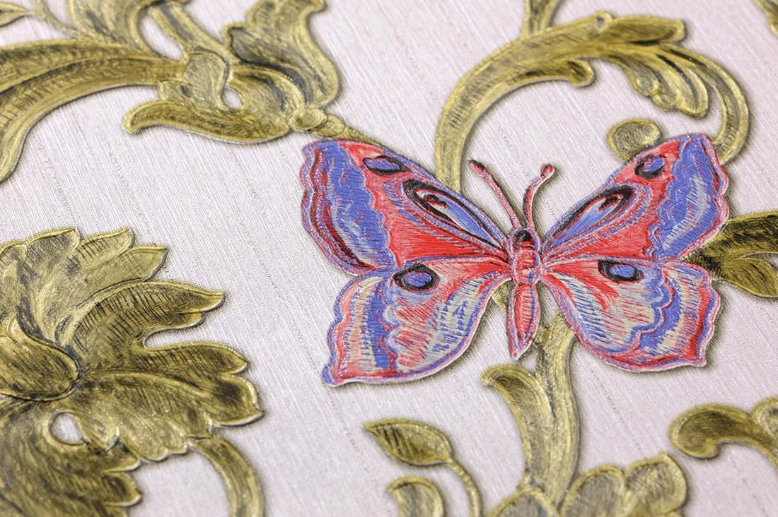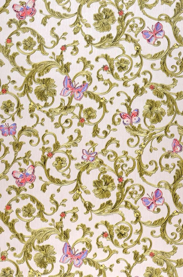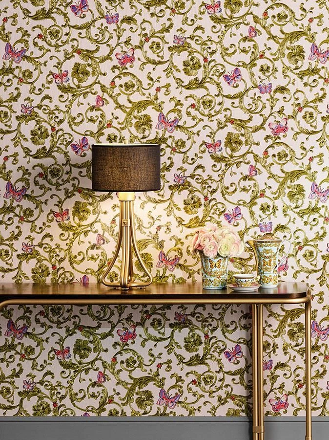 Pompös und plastisch inszeniert wie historische Stuckhandwerkskunst präsentiert sich die Ausführung der Versace Luxustapete Glory. Ein bunt schimmerndes Farbenbouquet aus Blaulila, Erdbeerrot, Olivgelb Schimmer, Grünbeige Schimmer verleiht den floralen Ornamenten, Schmetterlingen und kleinen Käfern eine herausragende Anziehungskraft.