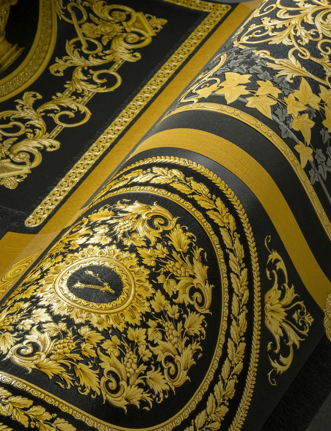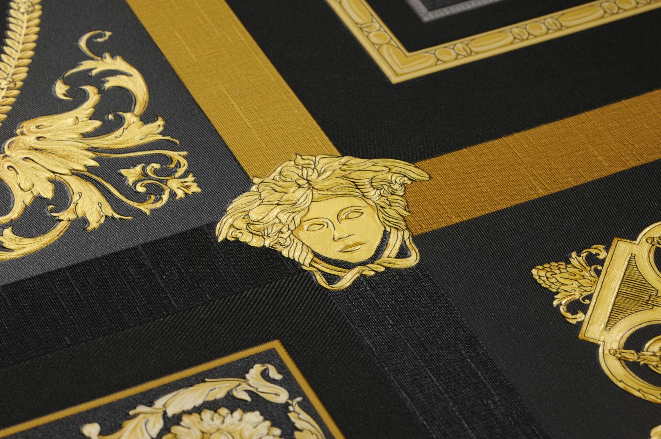 Prächtig und gleichzeitig würdevoll wirkt die Kombination von Gold und Gelbtönen einerseits, Schwarz und Grautönen andererseits, die Versace für seine beeindruckende Vliestapete Minerva gewählt hat. Sie unterteilt Ihre Wand in Quadrate mit unterschiedlichen barocken Mustern von Blattranken über antike Vasen bis hin zu stilisierten Blüten. Die verschiedenen Zierbänder, die die Quadrate voneinander absetzen, sorgen zusätzlich für Abwechslung.