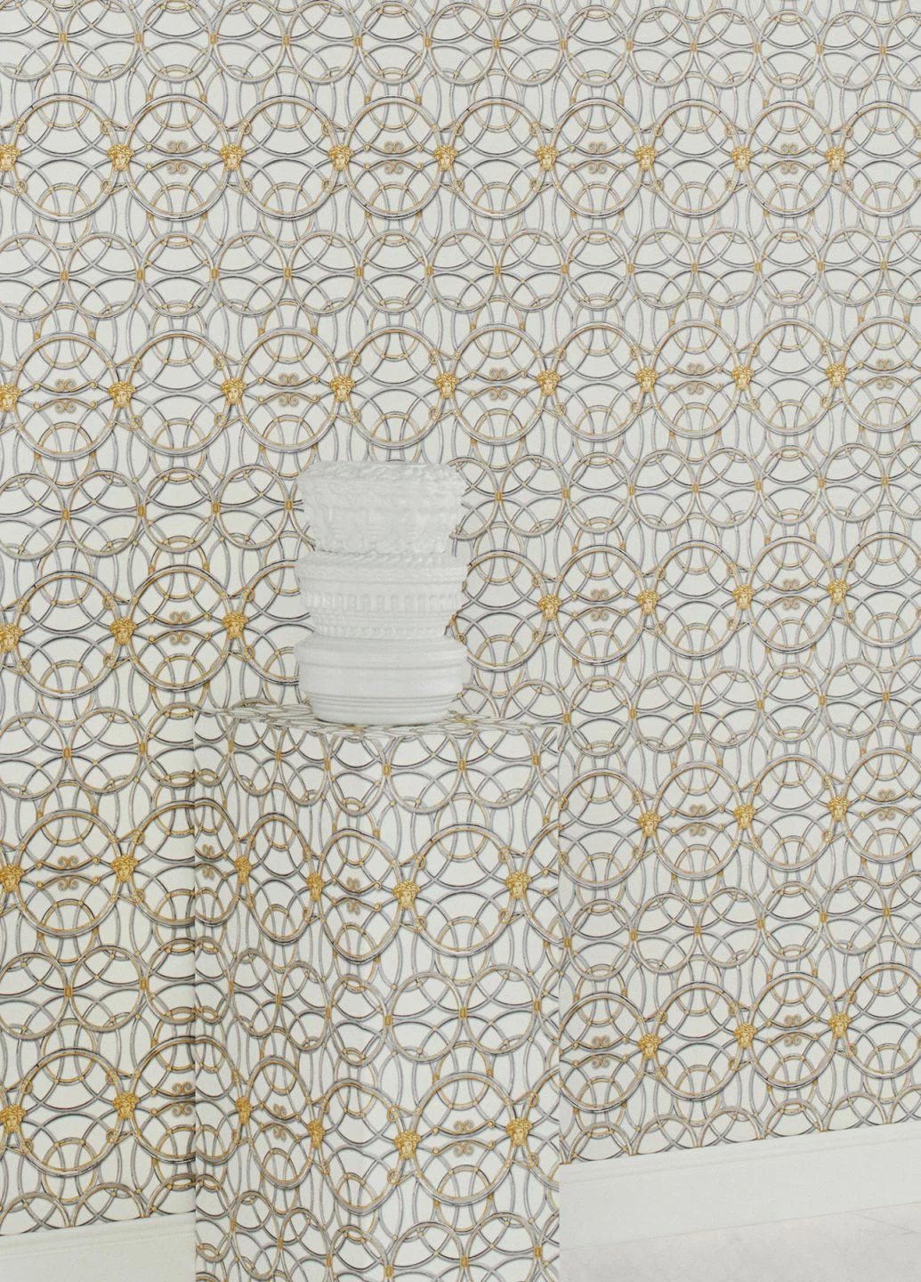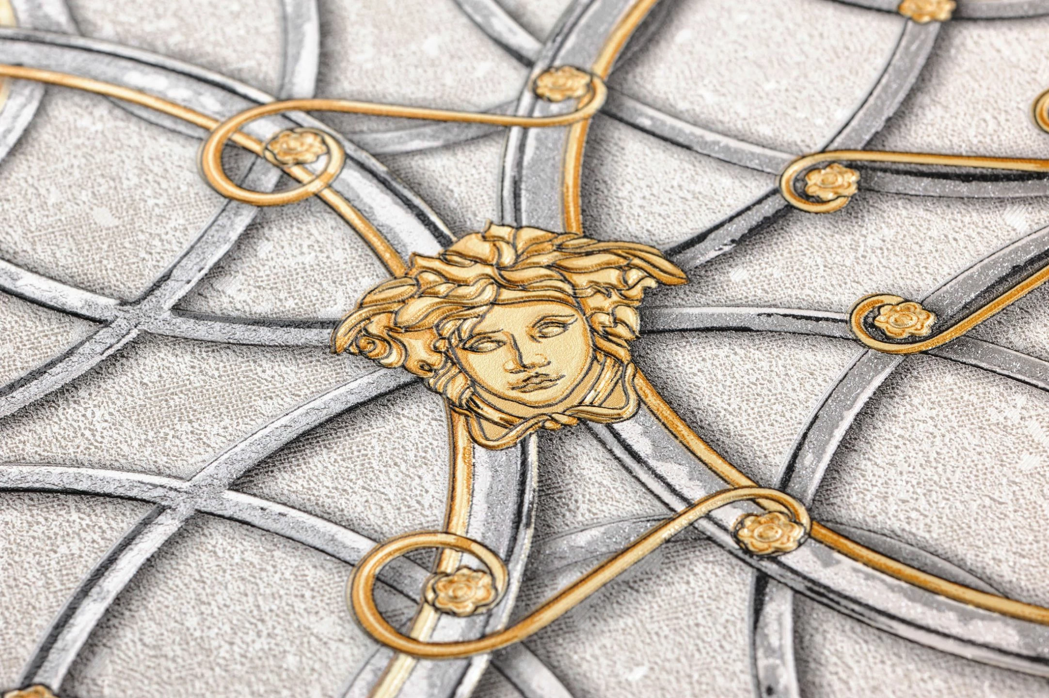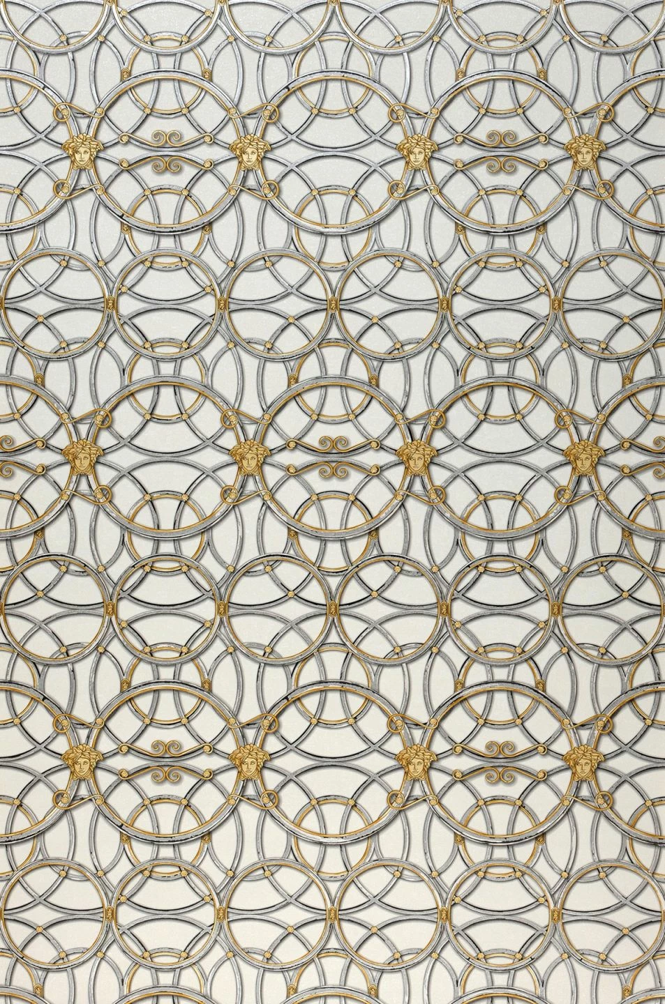 Mit Ringketten, die sich vor, hinter sowie ineinander verflechten und von Medusen-Köpfen flankiert werden, präsentiert sich die helle und goldaffektierte Variante des Versace-Tapetenmodells Nara. Das dominante reliefartige Muster fordert den Betrachter und ist für Räume, in denen Kreativität gefragt ist, ideal. Durch die scheuerbeständige Vinyloberfläche wird die Tapete selbst hohen Reinigungsanforderungen gerecht.