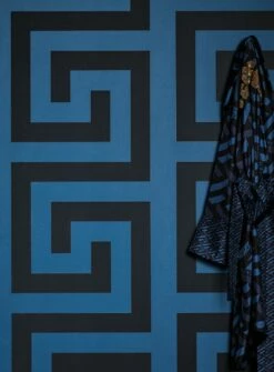Eine echte klassische Schönheit ist Versaces Solea mit ihrem Mäander-Muster, das der altgriechischen Ornamentik entlehnt ist. In Blau und Schwarz wirkt das Design klar und edel und strahlt eine ruhige Kraft aus. Die Vinyloberfläche ähnelt einem gewebten Stoff und schimmert leicht. Gleichzeitig sorgt sie dafür, dass die scheuerbeständige Tapete auch in Ihrem Badezimmer eine beeindruckende Figur macht.