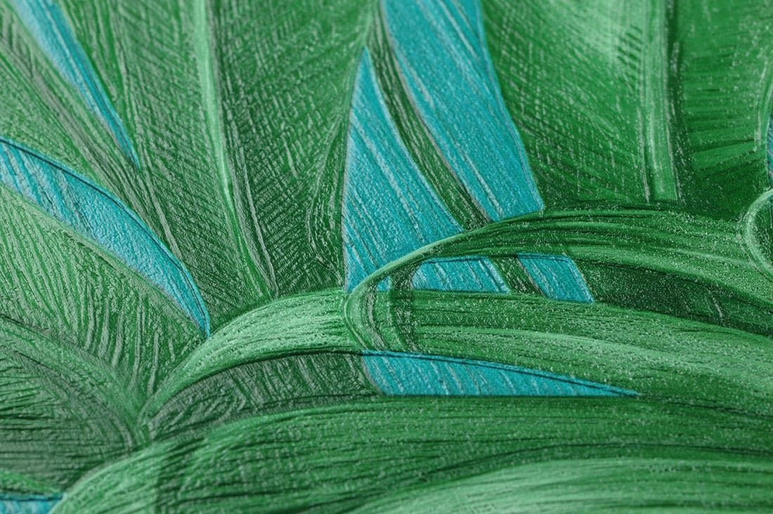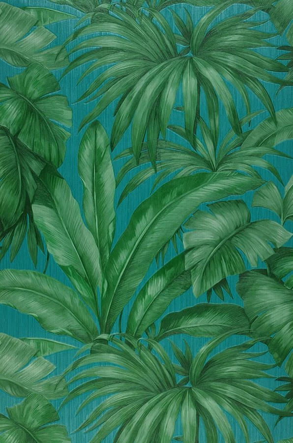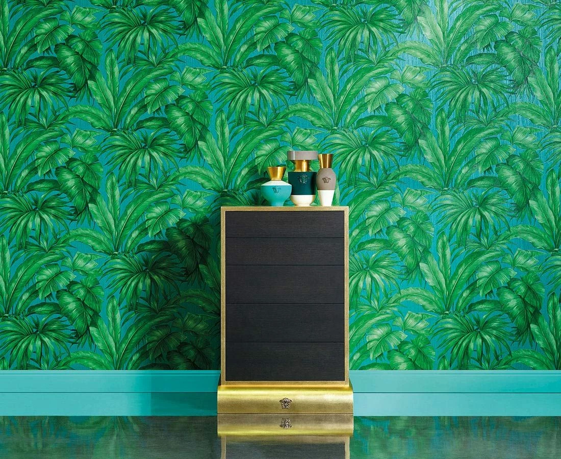 Eine perfekte Gratwanderung zwischen Realismus und Stilisierung ist Versace mit dieser Designertapete gelungen. Die üppigen Palmenblätter in helleren und dunkleren Grüntönen sind detailgetreu gezeichnet und erhalten durch das feine, fühlbare Relief der Vinyloberfläche zusätzliche Authentizität. Gleichzeitig erhält der Verzicht auf die Darstellung von Stämmen und Zweigen und die Anordnung der Blätter die Stilisierung aufrecht. Auch Ihr Badezimmer können Sie mit dieser scheuerbeständigen Tapete in eine grüne Oase verwandeln.