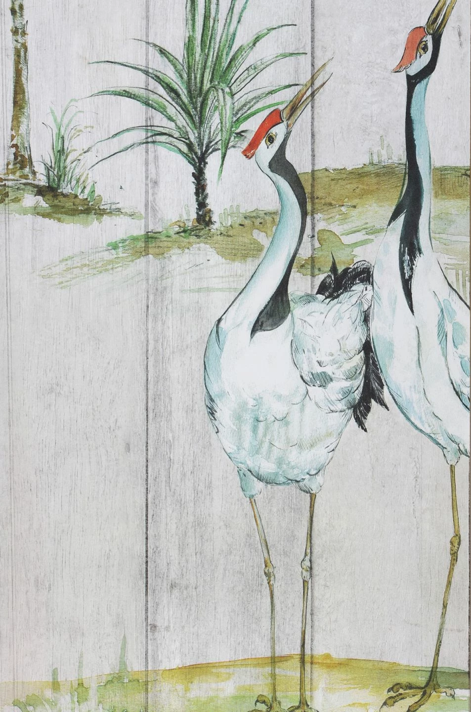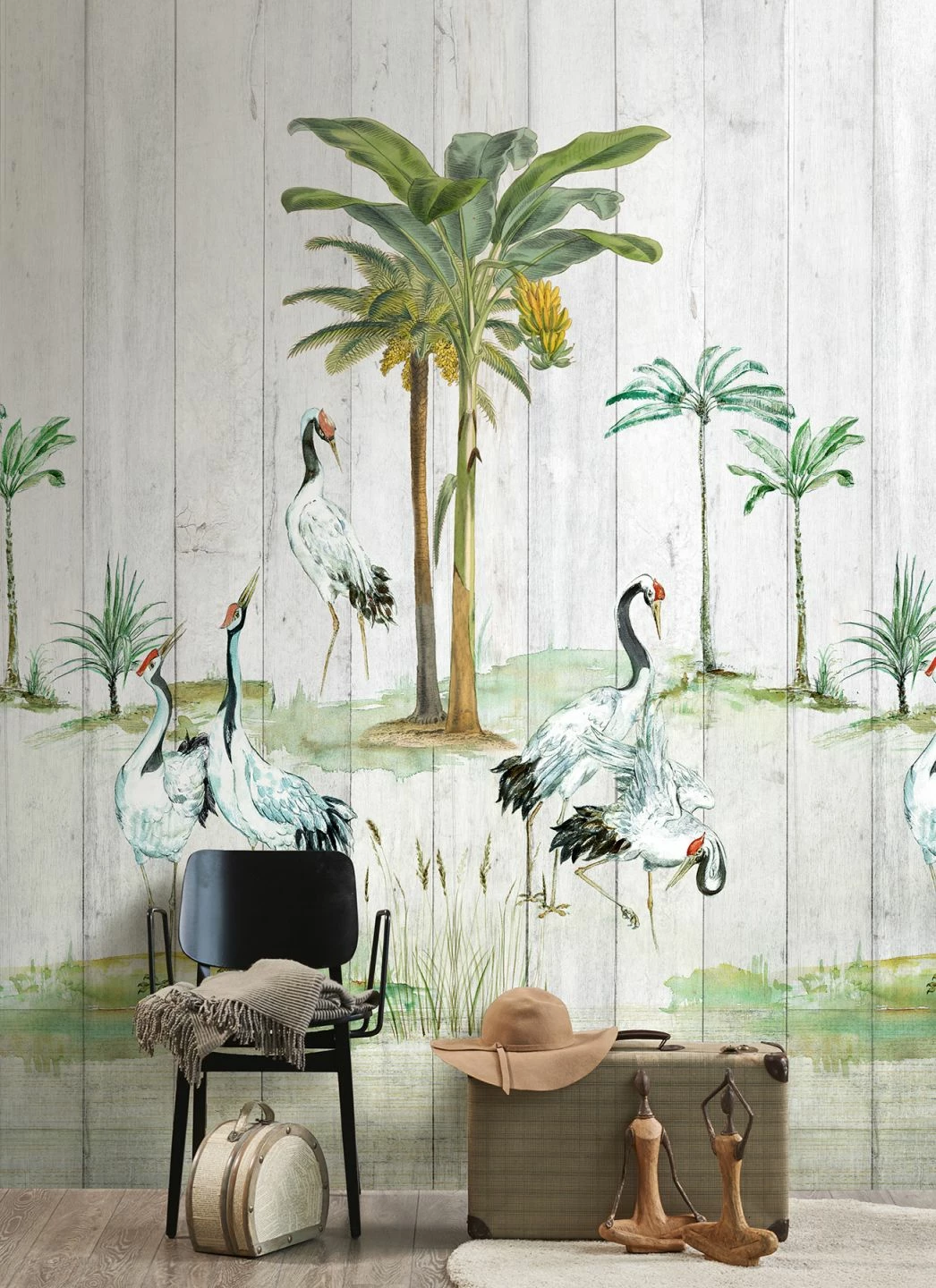 Diese Szene mit Wasservögeln, Schilf und Palmen könnte in der Südsee spielen. Das maritim-tropische Flair des dreiteiligen Wandbildes zieht gute Laune an, entspannt und regt zum Tagträumen an. Die hoch waschbeständige Vinylbeschichtung der Romantik Tapete erlaubt einen sehr flexiblen Einsatz.