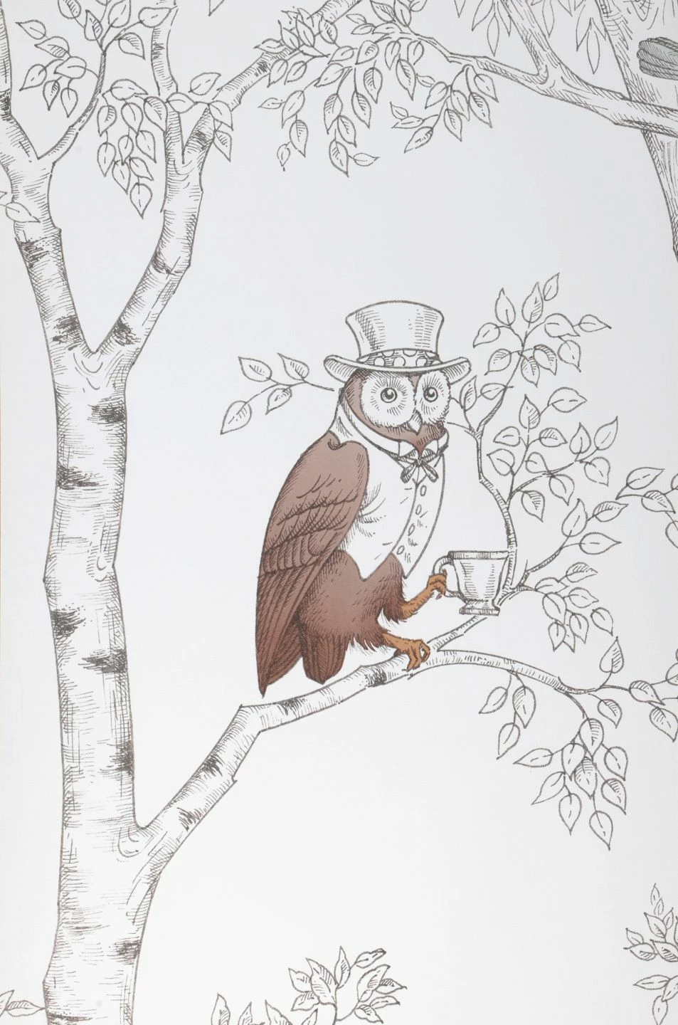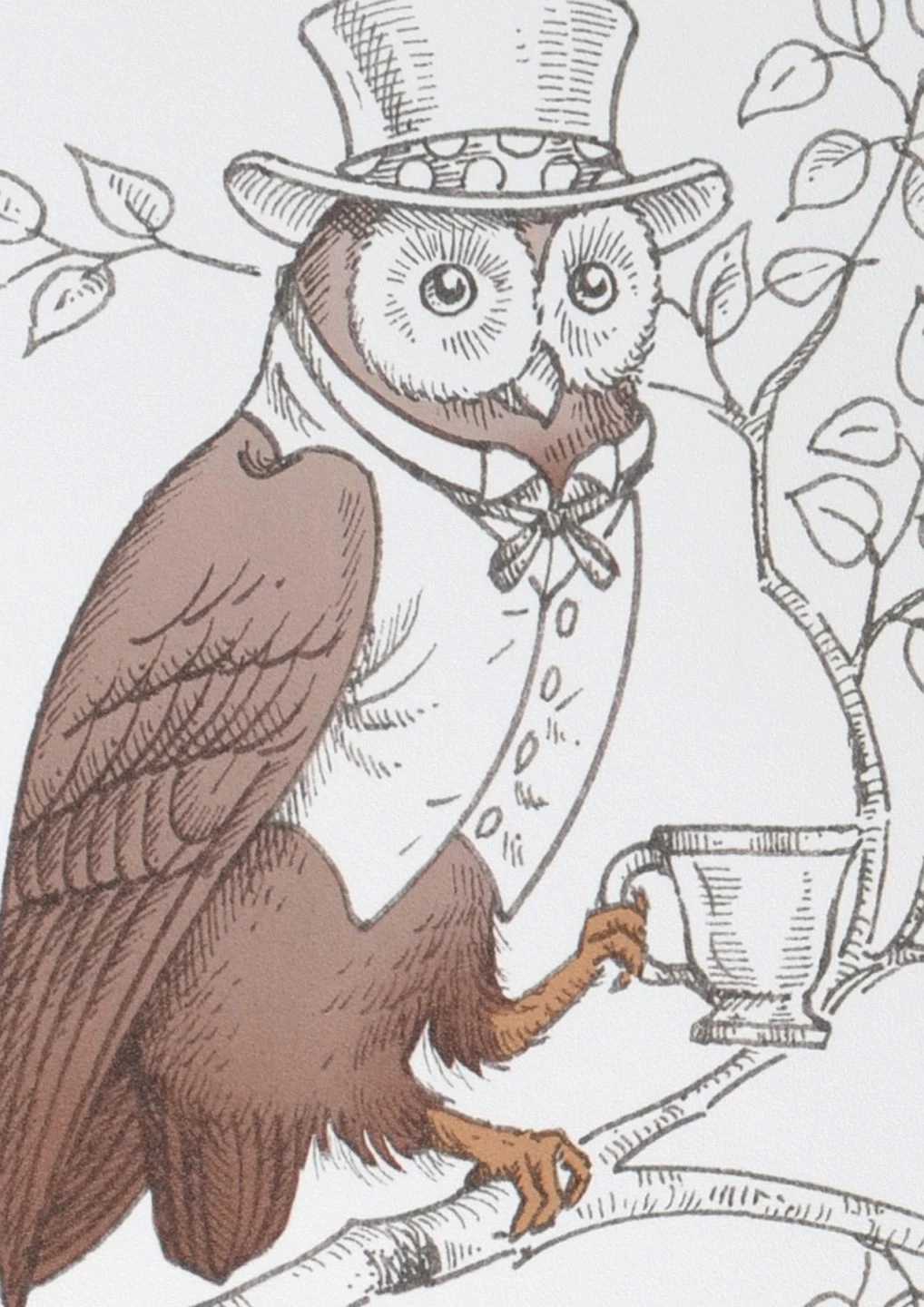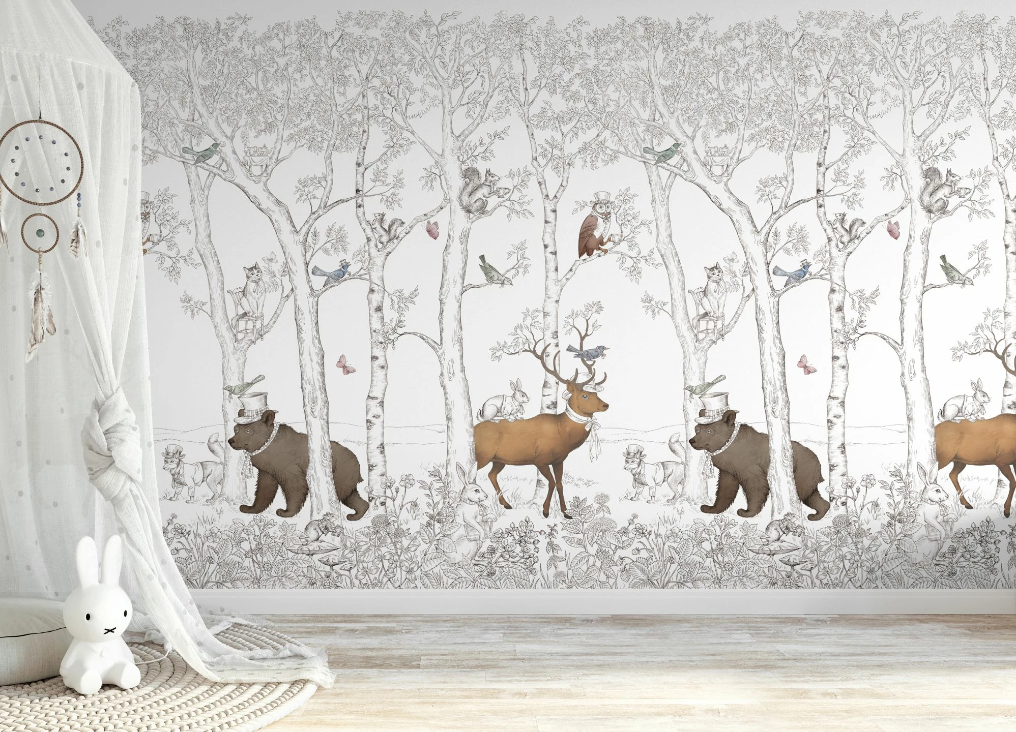 Wir blicken vom Rand eines zauberhaften Märchenwaldes zwischen den Bäumen hindurch in die Landschaft. Ausgestattet mit witzigen Accessoires wie Hüten, Westen und Krawatten bevölkern die Bewohner des Waldes das Wandbild: Bären und Hirsche, Hasen und Mäuse, darüber tummeln sich auf den Ästen Eichhörnchen, Singvögel, Eulen und Katzen. Das Wandbild aus vier Bahnen können Sie beliebig erweitern und den Maßen Ihres Kinderzimmers anpassen.